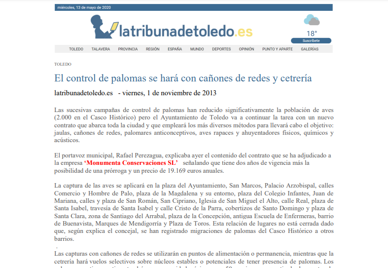 Somos líderes en la captura de palomas a nivel nacional, con más de 150.0000 palomas capturadas para más de 25 Ayuntamientos de toda España, e infinidad de clientes públicos y privados de todo tipo, incluyendo el Real Madrid, el Museo del Prado o el Hospital Gregorio Marañón, entre otros. Con una eficacia de los tratamientos que muy pocos competidores logran alcanzar, hemos desarrollado proyectos en 15 de las 17 comunidades autónomas españolas, desde Canarias hasta el norte peninsular.